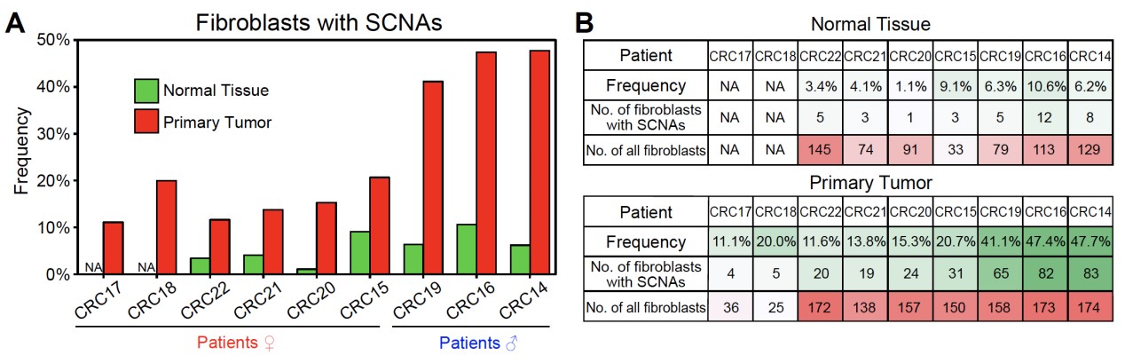 图4. 发生基因组拷贝数变异的成纤维细胞在肿瘤组织中的比例远远高于在癌旁“正常”组织中的比例