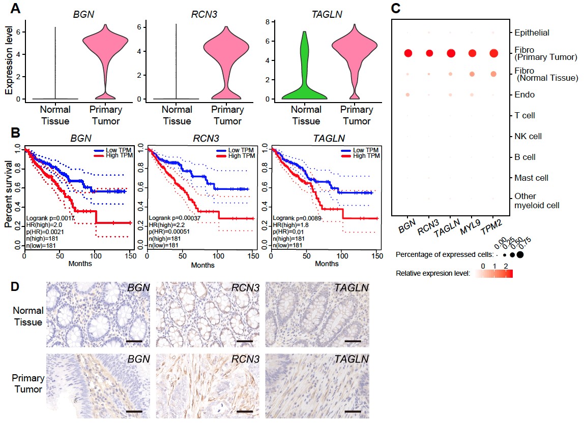 研究人员鉴定出肿瘤组织中成纤维细胞相对于癌旁组织中成纤维细胞差异表达的76个基因,包括59个上调基因和17个下调基因。其中BGN、RCN3、TAGLN、MYL9和TPM2在肿瘤组织成纤维细胞中明显上调,经TCGA数据库验证,其高表达与结直肠癌预后差明确相关。免疫组化实验进一步验证了这5个基因在结直肠癌肿瘤微环境成纤维细胞中特异性高表达,确定了这5个基因是肿瘤微环境中成纤维细胞特异性表达的肿瘤标志基因(图6)。这一发现拓展了肿瘤标志基因的种类,从原来主要聚焦于癌上皮细胞表达的标志基因变成同时关注肿瘤微环境细胞中特异性表达的肿瘤标志基因。而且肿瘤微环境细胞特异性表达的肿瘤标志基因更有可能具有跨不同癌种的普适性,其临床应用场景可能更广泛。