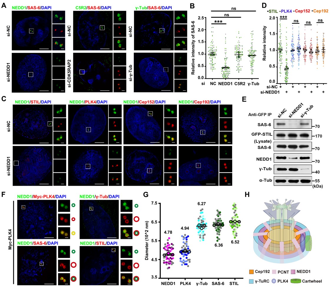 在本项工作中,该团队发现NEDD1蛋白的缺失严重破坏了车轮结构装配和子中心粒发生的起始。在正常情况下,PCM的分层结构是受到严格调控的,PCM蛋白被顺序招募到中心体上,Cep192呈环状分布,PCNT呈放射状分布,它们两个协同招募了NEDD1以环状的形式定位在中心体上,从而使NEDD1可以与PLK4在G1期共定位,而NEDD1蛋白招募了γ-TuRC到PCM上。进一步地,通过超高分辨率显微镜观察发现NEDD1作为一个基座协助起始了车轮结构的装配和子中心粒的发生。