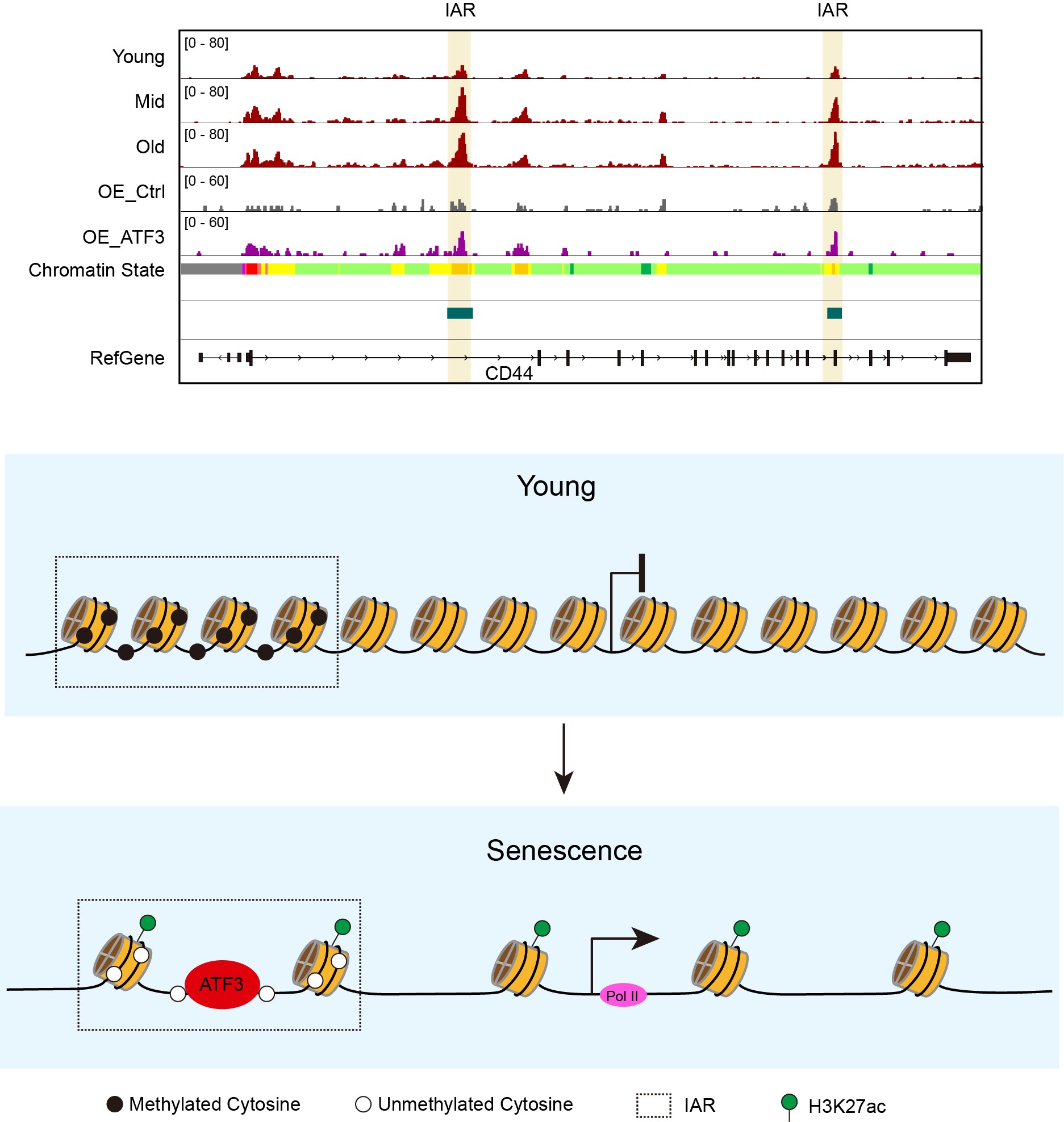 全基因组的染色质可接近性在衰老过程中经历了规律的重排过程,这与衰老过程中DNA甲基化的重建模式非常相似。为了探究二者的关系,研究人员将HUVEC衰老中的5-甲基胞嘧啶DNA甲基化与ATAC-seq图谱进行了比较,发现在衰老过程中ATAC-seq信号与DNA甲基化水平呈负相关,DNA甲基化信号在ATAC-seq信号富集的区域都比较低,尤其是在调控元件区域,如启动子和增强子。通过分析IARs和DARs中DNA甲基化水平的变化规律,发现在衰老过程中,IARs中的DNA甲基化水平逐渐下降,而DARs中的DNA甲基化水平逐渐上升,因此,DNA甲基化的丢失可能有助于调控元件所在的染色质区域开放性增加。最后,模体富集分析发现AP-1转录因子家族成员,特别是ATF3,在IARs区域的富集程度最高,并且结合程度随着衰老逐渐增强。实验证实了ATF3能够驱动染色质可接近性的重塑,导致衰老关键基因的表达,促进衰老的发生。