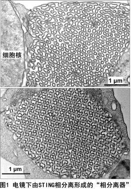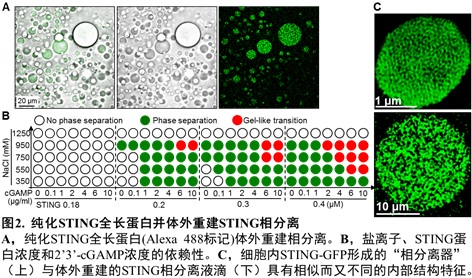 nm左右的小膜泡,STING非常密集地分布于膜泡外围。他们利用纯化STING全长蛋白在体外重建了相分离体系,并进行了一系列的机制研究。发现超过一定浓度(阈值)的2’3’-cGAMP可以强烈诱导STING蛋白发生相分离;而Mn2+可显著降低所需的2’3’-cGAMP浓度,Mg2+或Zn2+则无此作用。有趣的是,体外重建获得的STING液滴也具有非均质的内在结构(图2)。