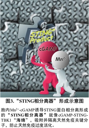 细胞质中,病毒感染后活化的cGAS持续性地产生并且累积2’3’-cGAMP,而目前尚没有发现细胞质内特异性降解2’3’-cGAMP的磷酸酯酶。这些结果提示:细胞内适度水平的2’3’-cGAMP会诱导STING转运至高尔基体并发生抗病毒天然免疫通路的活化;而在病毒感染后期,细胞内过度累积的2’3’-cGAMP则能够诱导留存在内质网、没有被活化的STING蛋白发生相分离。后续的实验结果提示STING相分离产生的内质网膜“立方膜结构”可能通过在空间上将STING-TBK1与关键转录因子IRF3进行“隔离”,进而负调节cGAS-STING通路。因此,这个由细胞内高浓度2’3’-cGAMP触发、Mn2+促进、STING蛋白相分离形成的内质网立方膜结构被命名为“STING相分离器”(The STING Phase-Separator),用于隔离细胞内未激活的STING-TBK1(也包括2’3’-cGAMP),从而在另外一个层次保证天然免疫不会过度活化(图3)。实际上,该内质网立方膜结构的作用方式可能像一个细胞内的2’3’-cGAMP-STING-TBK1“海绵”,吸附并隔离天然免疫关键分子。这样的负调节机制还暗示细胞可能并不需要胞内的特异性磷酸二酯酶来水解病毒感染后期细胞质中过度累积的2’3’-cGAMP。