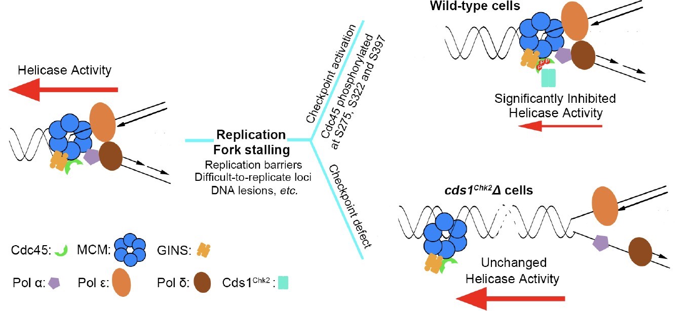 通过大规模的遗传筛选,孔道春实验室发现,复制解旋酶 CMG(Cdc45-MCM- GINS)复合体的一个亚基 Cdc45 的突变能极大降低(600-3000 倍)checkpoint 通路缺陷的细胞对 HU 的敏感性,暗示 Cdc45 或 CMG 复合体可能被 checkpoint 调控。然后, 通过一系列遗传及生化分析,证明 Rad3ATR-Cds1Chk2 checkpoint 通路直接调控 DNA 复 制解旋酶 CMG 复合体。孔道春实验室发现:当 DNA 复制叉停顿后,Cds1Chk2 同时磷酸化 Cdc45 亚基上的三个丝氨酸残基(且这三个 Chk2/Chk1 磷酸化位点在不同物种中相对保守)。这三个丝氨酸残基的磷酸化导致 CMG 复制解旋酶活性深度降低。CMG 复制解旋酶活性的降低使得它不能脱离停顿复制叉,不能与被阻挡的DNA 聚合酶分开。这样,停顿的 DNA 复制体(Replisome)及复制叉的生化完整性得到了维持,从而阻止了停顿 DNA 复制叉的垮塌。