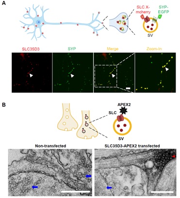 (A) Top: 荧光成像筛选突触小泡定位的SLC转运体示意图。Bottom:SLC35D3与突触小泡特异蛋白SYP共定位。比例尺:10 μm。(B) Top: 电镜探究SLC转运体亚细胞定位示意图。Bottom:SLC35D3-APEX2电镜成像。红色箭头:转染SLC35D3-APEX2电镜标签的神经元中突触小泡。蓝色箭头:未被转染的神经元中突触小泡。比例尺:500 nm。