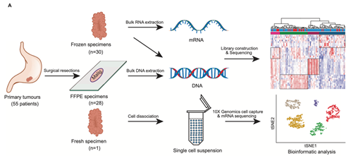 胃肝样腺癌(Hepatoid adenocarcinoma of the stomach, HAS)是临床上一种非常罕见,但恶性程度很高的胃部肿瘤。该肿瘤侵袭性极强,患者易出现肝脏和淋巴结的转移,患者预后极差。此肿瘤最早于1985年由日本学者所报道,因在组织形态学上能同时观察到胃腺癌及肝细胞肝癌特征故而得名。此外,此肿瘤高表达肝癌相关的分子标志物如AFP以及GPC3,血清学检测AFP升高常为其重要的临床特征。目前,手术切除是胃肝样腺癌的主要治疗手段,但对胃肝样腺癌的基因组和转录组特征的认知仍非常缺乏。