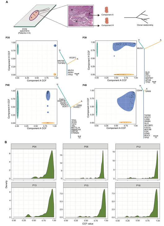 研究人员对胃肝样腺癌进行多组学联合分析,综合应用外显子测序、转录组测序和单细胞转录组测序方法,完成了55例胃肝样腺癌患者的58个肿瘤组织的外显子测序、30个肿瘤组织的转录组测序和1例患者肿瘤的单细胞转录组测序(图1)。研究人员分析了胃肝样腺癌的高频突变事件,绘制了基因突变图谱,并通过生物信息学分析证明胃肝样腺癌中不同形态的成分来自单克隆起源(图2)。