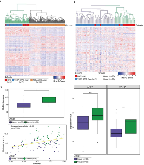 为了进一步探索胃肝样腺癌的基因表达特征,研究人员系统地对比了胃肝样腺癌和胃腺癌以及肝细胞肝癌的表达谱。研究人员发现,胃肝样腺癌虽具有与胃腺癌相似的基因表达特征,但胃肝样腺癌相比于胃腺癌具有更高的细胞干性以及更强的甲硫氨酸相关通路活性(图3)。