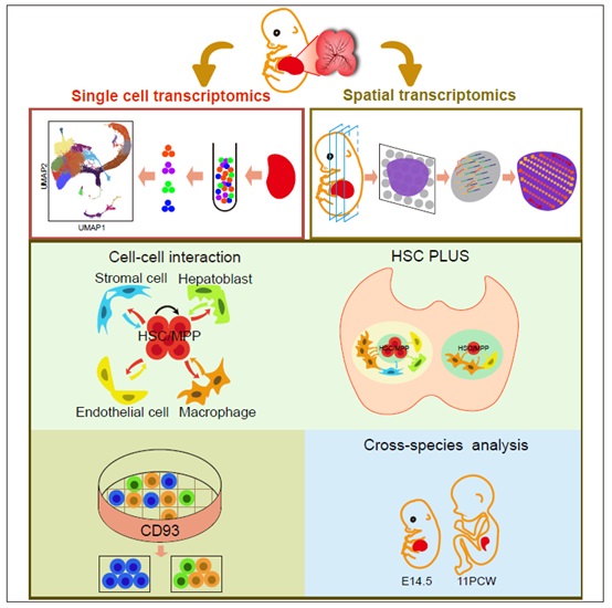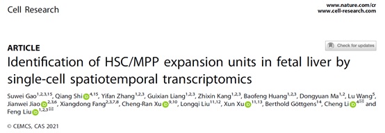 2021年8月2日,冰球突破mg正规官网李程团队与中国科学院动物研究所刘峰团队合作在Cell Research 杂志发表题为Identification of HSC/MPP expansion units in fetal liver by single-cell spatiotemporal transcriptomics的研究论文。该论文利用单细胞转录组和空间转录组联合分析的方法,绘制了小鼠胎肝发育的单细胞时空转录组图谱,解析了造血干/祖细胞的转录组和功能异质性,鉴定了造血干细胞扩增的功能单元(HSC ‘pocket-like’ units, HSC PLUS)并揭示其分子机制。