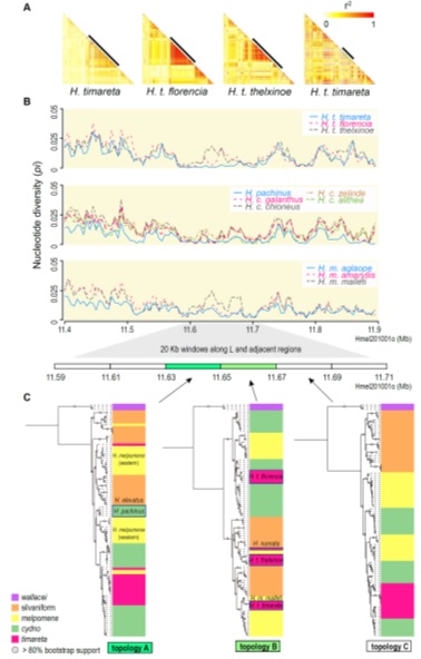 本研究通过分析袖蝶的全基因组分化模式,确定了一个在多个种群和物种之间普遍高度分歧的基因组区域L,群体遗传学分析表明L位点受到自然选择并表现出强烈的连锁不平衡。进一步的系统发育分析和基因流检测阐明了L位点是一个渗入的热点区域,并且具有不同于物种和翅膀图案模式位点的复杂演化历史。在蝴蝶和黑腹果蝇中的功能实验验证了L位点内的基因与昆虫运动功能相关,且这些基因仅在鳞翅目中聚类到基因组上的临近位置,提示运动功能可能参与了鳞翅目对环境的局部适应及物种形成过程。