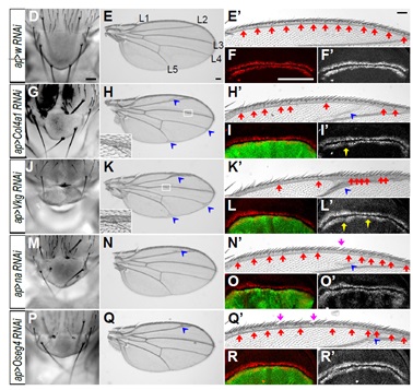图2 黑腹果蝇中L位点同源基因组织特异性RNAi引起的表型变化