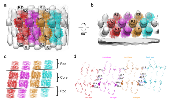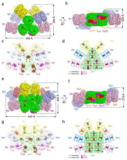 光合作用是地球上最重要的反应之一,将光能转化为化学能。光合作用的起始是光能的吸收和传递,这个过程通常是由光合生物的捕光天线复合体来完成的。藻胆体就是一类存在于蓝细菌和红藻中的捕光天线复合体。它吸收并传递光能给光反应中心,然后启动电子传递链,并产生后续的化学反应。虽然蓝细菌藻胆体上世纪70年代就已被体外纯化,但是半个多世纪以来仍没有获得其高分辨结构,这与藻胆体在体外只能存在于常温高盐环境有关。本研究解决了蓝细菌藻胆体冷冻制样的难题,通过冷冻电镜成功解析了两种蓝细菌藻胆体的高分辨率结构。这两种藻胆体都属于半碟形,一种是三核六杆(聚球藻,Synechococcus sp. PCC 7002),常见于单细胞蓝细菌(图1a-d);另一种是五核八杆(鱼腥藻,Anabaena sp. PCC 7120),常见于丝状体蓝细菌(图1e-h)。