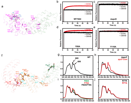 藻胆体吸收的能量经过色素团(bilin)的传递最终会聚集在ApcE和ApcD上,ApcE和ApcD分别是EET到光系统II和光系统I的终端发射器。高分辨的结构提供了藻胆体上色素团的精确分布。藻胆体的色素团之间的距离一般都在30 Å左右。实际上,光能在藻胆体的内部的传递是非常迅速的,这表明在藻胆体内部还存在别的介质传递光能。藻胆体蛋白富含丰富的芳香族氨基酸,而芳香族氨基酸的苯环可以和色素上的四吡咯环形成π-π相互作用,所以领域内猜测芳香族氨基酸在能量传递中存在非常重要的作用。为了验证这些假设,本研究针对藻胆体能量传递的终端亚基ApcF和ApcD,系统性的设计了芳香族氨基酸点突变实验,并首次利用实验证据证明了藻胆体蛋白的芳香族氨基酸对光能传递的重要作用(图2a-j)。