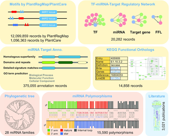 MicroRNA是真核生物中普遍存在的一类具有基因调控功能的内源小RNA。植物的microRNA在生长发育中发挥重要功能,影响器官发育、形态建成、环境适应等重要生物学过程,日益成为作物分子育种的重要基因资源。得益于测序技术的发展,关于植物microRNA的数据与日俱增。为系统权威地提供植物microRNA的注释信息,研究组以统一流程和标准对植物深度测序数据进行了microRNA鉴定和信息整合,建立了一个综合性数据库,命名为植物microRNA百科全书(Plant microRNA Encyclopedia,http://www.pmiren.com)。PmiREN1.0于2019年10月发布,两年间全球累积访问量超过16万次。