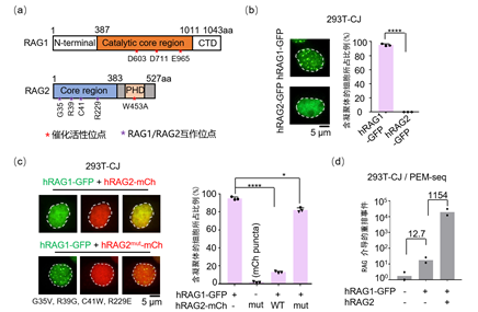 该研究首先通过过表达以及内源荧光标记方式在多种细胞系中利用共聚焦成像技术观察并证明了人RAG1蛋白而不是RAG2在细胞核内形成凝聚体的现象(图1a-b);进一步的研究发现,RAG2的存在可以破坏RAG1的凝聚状态(图1c)。接着利用实验室2019年开发的PEM-seq高通量测序方法,在整合了RSS序列的293T细胞中检测了凝聚状态和游离状态的RAG1活性。测序结果显示,凝聚态的RAG1几乎不能介导V(D)J重排,相反游离态的RAG1的重排酶活性增加了1154倍(图1d)。当利用RNA结合蛋白FUS迫使RAG1一直以凝聚体形式存在时,其重排酶活性也会被抑制。这表明细胞内RAG1的重排酶活性是受到自身凝聚体状态的调控的,这也能很好的阐述发育中的淋巴细胞在G1周期之外如何保护自身基因组的完整性。为了进一步研究RAG1凝聚体形成机制,研究人员进行了一系类氨基酸功能位点的突变(图1a),发现RAG1蛋白的催化活性中核心氨基酸DDE和位于蛋白质N端核定位信号对其产生凝聚作用发挥了重要的作用。此外,该研究还发现RAG2是通过与RAG1直接的相互作用来破坏RAG1自身的凝聚状态,而不依赖RAG2的PHD功能域(图1c)。