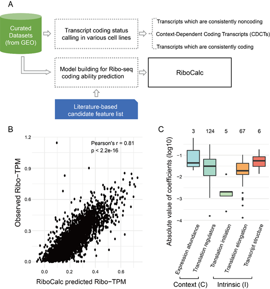 在此基础上,作者应用数据驱动的特征选择算法,综合运用序列内生(intrinsic, cis-)和细胞环境(contextual, trans-)特征,建立了人类RNA转录本编码能力跨细胞定量模型RiboCalc,实现了对人类转录本在多种细胞环境下的编码能力(即Ribo-seq表达量Ribo-TPM)的高精度预测(r = 0.81)。进一步模型分析显示,转录本的序列和所在细胞环境都对编码能力的决定起到了重要作用。值得注意的是,自14年以来即有若干工作报导一些传统被注释的非编码RNA可以在特定条件下结合核糖体甚至产生肽段(如 ADDIN EN.CITE ADDIN EN.CITE.DATA [1]),RiboCalc模型分析显示,这些RNA转录本与不结合核糖体的RNA转录本相比编码能力分数显著高,进一步提示转录本的编码能力不应被简化为单纯的编码/非编码二分分类,而是一个依赖于环境的连续定量指标。