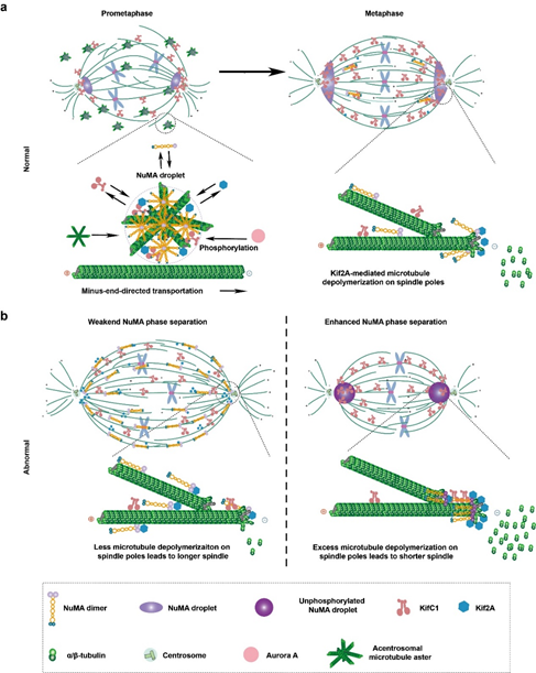 之后的功能研究发现,NuMA在纺锤体极上的凝集调控了Kif2A在纺锤体上的空间定位,将Kif2A隔离到纺锤体极上,对纺锤体极上的微管进行解聚,从而调控了微管动态性,纺锤体长度以及染色体分离。NuMA在前中期形成液滴并凝集到纺锤体极的现象,也促进了非中心体依赖形成的微管向中心体依赖形成的微管移动和捕捉的过程。
