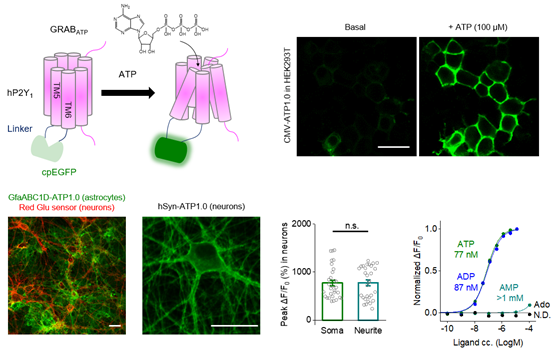 2021年12月22日,冰球突破mg正规官网李毓龙实验室在Neuron杂志在线发表了题为A sensitive GRAB sensor for detecting extracellular ATP in vitro and in vivo的研究论文,报道了新型基因编码的ATP探针GRABATP1.0的开发和在体外及活体动物的应用。李毓龙实验室自2018年以来,先后开发了针对乙酰胆碱、多巴胺、去甲肾上腺素、腺苷、五羟色胺、内源大麻素等神经递质或调质的荧光探针,此次发表的GRABATP1.0是其又一力作,进一步扩展了GRAB系列荧光探针家族。