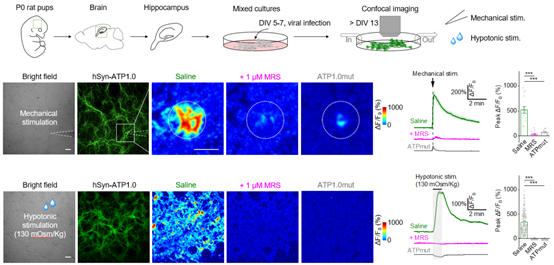 ATP1.0探针能否用来检测内源释放的ATP呢?作者从原代培养的海马细胞入手,发现ATP1.0能够检测到机械刺激及低渗透压刺激引发的ATP释放,药理学实验及突变型探针实验进一步验证了ATP1.0检测信号的特异性(图2)。有意思的是,在不给予额外刺激时,ATP1.0也能灵敏地记录到直径约为30微米的自发性ATP释放事件,表明ATP的释放具有化学分子特异和空间特异性。