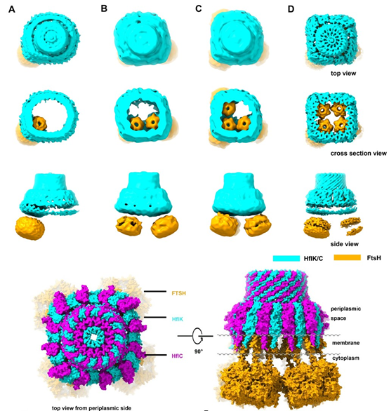 首先,冷冻电镜结构数据表明HflK/C以异源二聚体为基本单元,12个HflK分子和12个HflC分子间隔排列在内膜上形成跨膜的异二十四聚体的笼状结构。HflK/C的跨膜区域(N-terminal region)形成并隔离出大约直径20 nm的一个圆形膜区域;HflK/C的大部分氨基酸残基位于周质空间,并且组装成一个完全密封的笼状结构。更为有趣的是,FtsH六聚体可以悬挂到HflK/C形成的微型膜域中,一个笼状结构最多可以包含4个FtsH六聚体(图1)。FtsH六聚体的周质空间结构域(PD)完全包裹在HflK/C在周质空间形成的笼状结构中,与复合物中HflK分子的SPFH结构域直接相互作用。