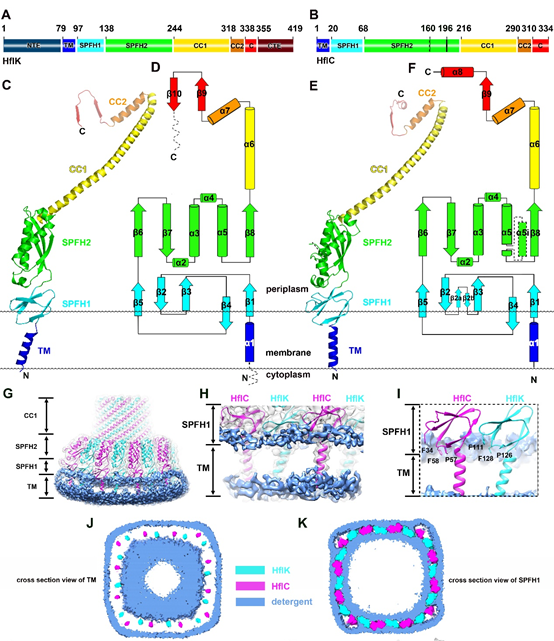 图2:HflK/C的结构模型、结构域组成及细胞膜微域的形成。