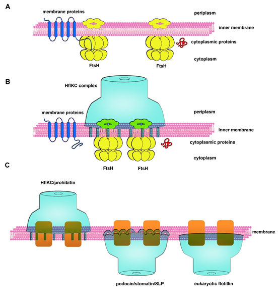 SPFH(Stomatin、Prohibitin、Flotillin 和HflK/C)家族是一类定位于各种各样生物膜系统的膜蛋白,包括质膜、核膜、高尔基体、内质网、内体、线粒体、叶绿体,乃至脂滴(Browman et al., 2007)。SPFH家族蛋白质是FMM中的标志性分子,基于其寡聚性质被推测在FMM的形成和组织过程中可能起到基础的支架作用。例如,早期的研究发现溶血性贫血病人的红细胞中缺失了Stomatin蛋白。Stomatin及其动物同源蛋白存在于质膜、细胞内的膜泡中,参与细胞内脂质运输以及机械感受型离子通道蛋白的调控等。在线虫和小鼠中,Stomatin的同源蛋白被发现参与到机械感知,可以调控酸通道和细胞骨架之间的信号传递(Huang et al., 1995; Wetzel et al., 2007)。Flotillin在细菌、动物、植物、真菌中广泛存在。在动物细胞中,Flotillin常与鞘磷脂和胆固醇一起形成脂筏结构,尤其是flotillin-1常被作为脂筏的标志性蛋白。Flotillin参与细胞内吞、以及膜上的多种信号转导过程(Artal-Sanz and Tavernarakis, 2009)。PHB(包括PHB1和PHB2)通过与线粒体内膜上的m-AAA蛋白酶形成超级复合物,参与线粒体内膜蛋白的质量监控。HflK和HflC是细菌中广泛存在的两种SPFH膜蛋白。它们是线粒体PHB的细菌同源蛋白,能够与锚定在细菌内膜的AAA+蛋白酶FtsH形成超大复合物(HflK-HflC-FtsH,简称为KCF复合物)从而调控膜蛋白的质量控制和稳态调控。