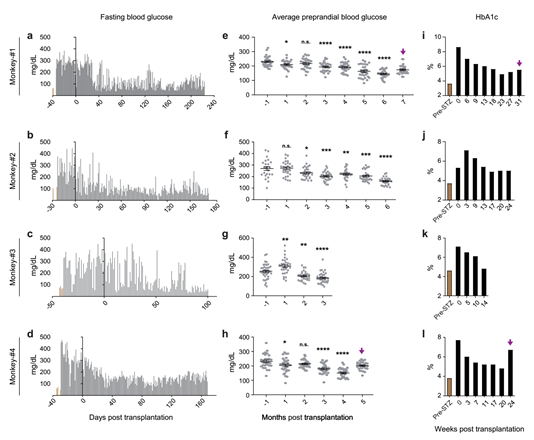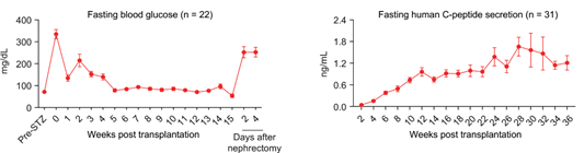 图3.人多能干细胞分化的胰岛细胞移植入糖尿病猴模型有效改善其血糖控制。