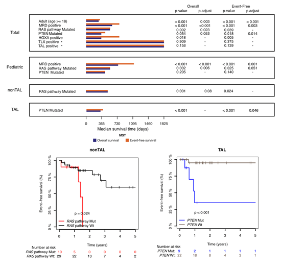 上:与生存期相关的临床因素和突变信息;左下:非TAL亚型中RAS信号通路突变与患者预后的相关性;右下:TAL亚型中PTEN突变与患者预后的相关性。