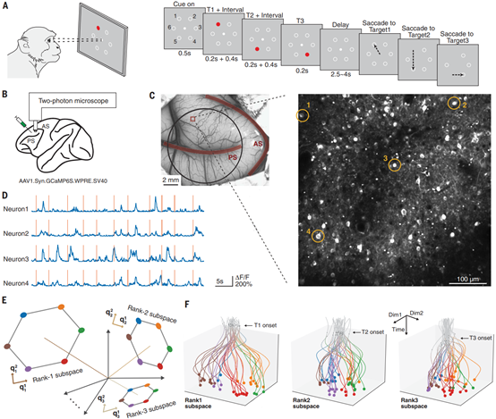 大脑序列记忆的神经编码机制:A, 猕猴记忆光点位置序列;B-D, 双光子成像监测前额叶皮层PFC群体神经元活动;E-F, 序列记忆中的神经群体编码与解码