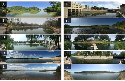 北京水体代表性采样点(A-E为静水水体,F-J为动水水体)。A. 白龙潭B. 冰球突破mg正规官网C. 世界公园D.雁栖湖E. 野鸭湖F. 坝河G. 潮河H. 莲花河I. 南长河J.温榆河