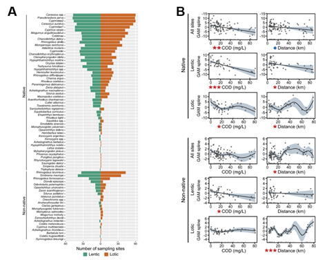 A. 本地和外来鱼种在静水和动水中的检测出现次数; B. 广义加性模型(GAM)显示本地和外来鱼类物种丰富度对COD及距城市中心距离的响应关系