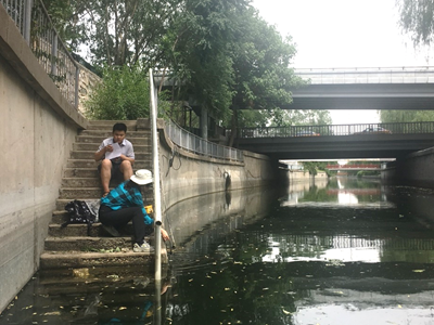 论文通讯作者姚蒙(右下)和志愿者进行城市水体水质指标测定