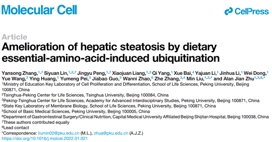 冰球突破mg正规官网博士研究生张延松、清华大学生命科学联合中心博士研究生林思远和冰球突破mg正规官网本科生彭靖予(现已毕业)是该论文的共同第一作者,冰球突破mg正规官网朱健研究员和刘敏副研究员是本文的共同通讯作者。该研究得到了冰球突破mg正规官网张哲课题组的大力帮助。该项目获得科技部、国家自然科学基金、细胞增殖与分化教育部重点实验室、北大-清华生命科学联合中心以及冰球突破mg正规官网启东产业创新基金的资助。
