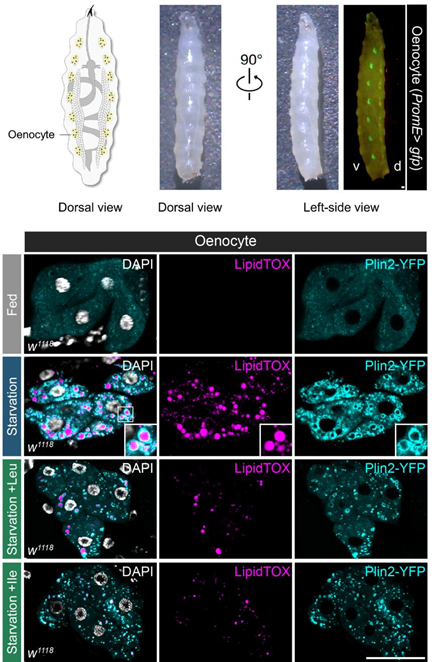 图2. 亮氨酸和异亮氨酸能够提升果蝇幼虫抵御绛色细胞中脂肪积累的能力