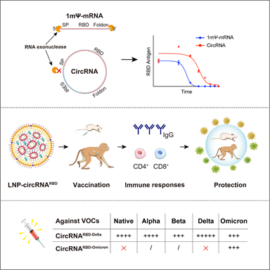 以上结果表明,针对新冠病毒德尔塔变异株设计的circRNARBD-Delta疫苗是具有广谱保护力的新冠肺炎候选疫苗,该研究也为针对当前新冠变异株迅速传播的疫苗研发和接种策略提供了参考依据。同时,该项平台型技术的建立在感染性疾病、自身免疫病、罕见病以及癌症的预防或治疗中具有广泛的应用前景。
