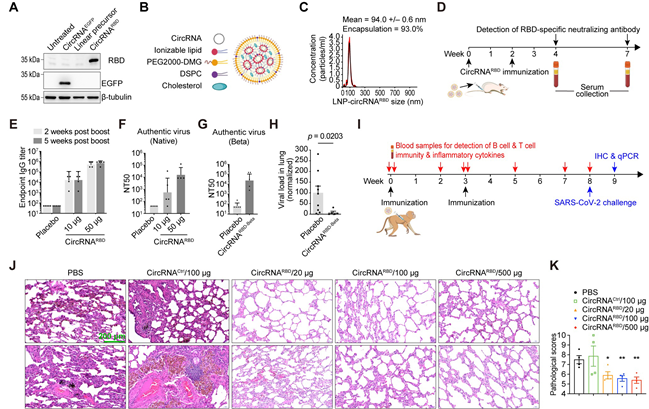 魏文胜团队首先建立了体外高效制备高纯度环状RNA的技术平台,针对新型冠状病毒及其变异株,设计了编码新冠病毒刺突蛋白(Spike)受体结构域(RBD)的环状RNA疫苗。实验证明,该疫苗可以在小鼠和恒河猴体内诱导产生高水平的新冠病毒中和抗体以及特异性T细胞免疫反应,并可以有效降低新冠病毒感染的恒河猴肺部的病毒载量,显著缓解新冠病毒感染引起的肺炎症状(图2)。