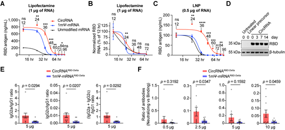 一系列的对比评估表明,与mRNA疫苗相比,circRNA疫苗具有以下特点或优势(图3):1)circRNA具有更高的稳定性,可以在体内产生更高水平、更加持久的抗原;2)circRNA疫苗诱导机体产生的中和抗体比例更高,可以更有效地对抗病毒变异,降低疫苗潜在的抗体依赖增强症(ADE)副作用;3)circRNA疫苗诱导产生的IgG2/IgG1的比例更高,表明其主要诱导产生Th1型保护性T细胞免疫反应,可以有效降低潜在的疫苗相关性呼吸道疾病(VAERD,Vaccine-associated enhanced respiratory diseases)副作用。