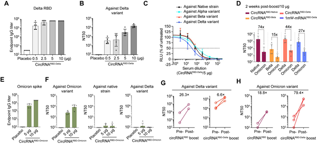 此外,在新冠病毒奥密克戎突变株被世界卫生组织列为值得关注的变异株(Variants of Concern,VOC)后,研究团队紧急启动了针对该突变株的环状RNA疫苗研发。在获得病毒序列信息的30天内,完成了从疫苗生产、小鼠免疫到有效性评估的全流程。研究发现,基于奥密克戎变异株的环状RNA疫苗(circRNARBD-Omicron)的保护范围狭窄,其诱导产生的抗体只能够中和奥密克戎变异株。而针对德尔塔变异株设计的环状RNA疫苗(circRNARBD-Delta)则可以在小鼠体内诱导产生广谱的中和抗体,有效中和包括奥密克戎株在内的多种新冠变异株(图4)。