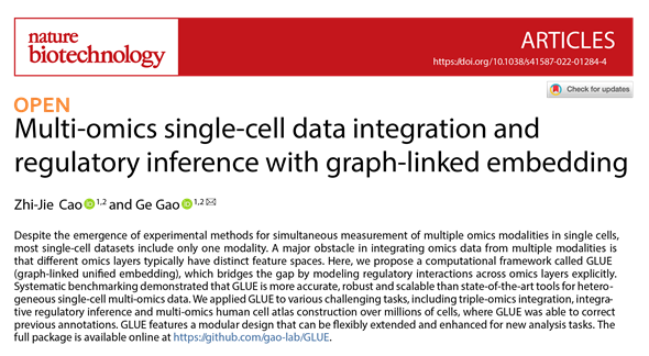 针对上述挑战,2022年5月2日,冰球突破mg正规官网高歌课题组于Nature Biotechnology发表题为“Multi-omics single-cell data integration and regulatory inference with graph-linked embedding”的研究论文,提出了基于图耦联策略的深度学习方法GLUE,首次实现了对百万级单细胞多组学数据的无监督精准整合与调控推断。