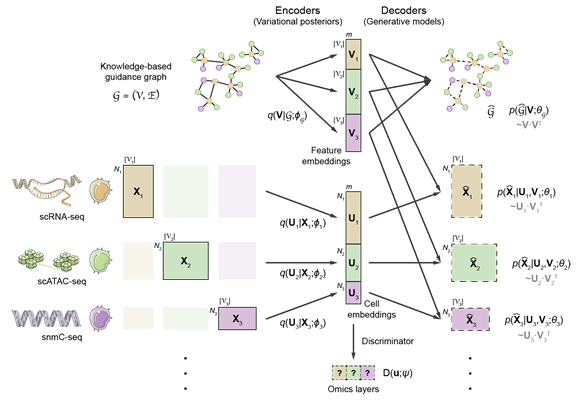单细胞多组学数据整合的一大挑战在于不同组学的特征空间存在差异,例如转录组的特征是基因,而染色质开放组的特征是染色质开放区段,不同特征空间的细胞缺乏可比性。为了解决这一问题,GLUE提出了全新的图耦联(graph-linking)策略,将组学特征间的先验调控关系表示成引导图(guidance graph)的形式,其中节点为组学特征,边为组学特征间的先验调控关系。模型采用变分图自编码器(Variational Graph AutoEncoder, VGAE)学习组学特征的低维表示作为组学数据的解码器权重,从而将不同组学的低维隐空间表示关联起来并确保其“语义一致性”;在此基础上,GLUE进一步引入对抗学习以消除不同组学降维表示之间的系统性差异(图 1)。