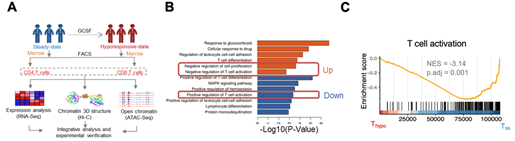 2022年5月18日,冰球突破mg正规官网黄晓军、李程、常英军合作,在《Advanced Science》期刊发表了 “Multiomics Analysis Identifies SOCS1 as Restraining T Cell Activation and Preventing Graft-Versus-Host Disease”的研究论文。在本项研究中,研究人员利用多组学测序手段RNA-seq,ATAC-seq,Hi-C等技术,分析了G-CSF动员前、后健康供者骨髓来源的CD3+CD4+和CD3+CD8+ T细胞的转录组、染色质开放性及三维基因组结构变化(图1A)。多组学分析提示,G-CSF动员后的T细胞中正向调控T细胞相关活化基因的表达水平下调,负向调控T细胞增殖及活化相关信号通路表达上调(图1B)。ATAC-seq分析也表明,T细胞活化相关基因所在染色质区域在G-CSF动员后的T细胞中染色质开放性下降(图1C)。