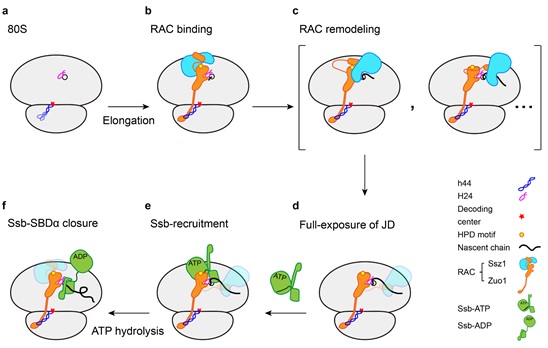 RAC是由Hsp40和Hsp70组成的稳定异源二聚体,在真核生物中高度保守,其在酵母中对应蛋白为Zuo1和Ssz1。Zuo1的J-domain(JD)结构域能够特异招募酵母的另一个Hsp70蛋白质因子Ssb1/2进入到处于新生肽链合成过程中的核糖体复合物(RNC,ribosome-nascent chain complex),并特异激活Ssb的ATPase活性。ATP水解之后的Ssb-ADP与新生肽链稳定结合直到其完成正确的折叠。遗传数据表明,Zuo1、Ssz1、Ssb三者对于新生肽链的正确折叠缺一不可。RAC系统的结构和功能机制一直是翻译调控领域的一个重要研究内容,迄今为止,该系统的具体分子机制的诸多细节尚不清楚,例如一个Hsp40如何与两个Hsp70配合、Hsp70 Ssz1的分子功能、Hsp40 Zuo1如何特异招募Hsp70 Ssb,新生肽链如何与三个蛋白质组分发生相互作用等等。
