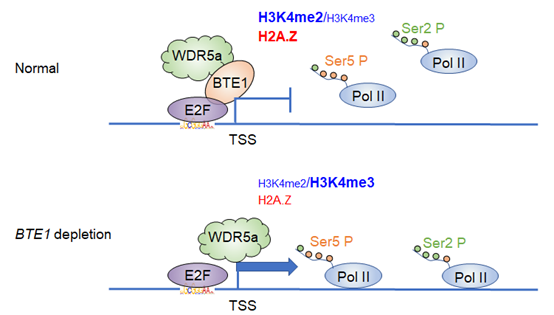 邓兴旺实验室朱丹萌课题组在对于植物特有非编码RNA HID1的研究中,发现拟南芥中HID1基因座下游1.8 kb的位置存在一个功能冗余的同源基因HIL1。野生型中HIL1的表达水平显著低于HID1,提示HIL1位点可能存在特异的转录抑制调控。通过正向遗传学筛选,课题组鉴定到一个植物DREAM复合体的特有亚基BTE1 (barrier of transcription elongation 1 ),其功能缺失能够回复hid1突变体幼苗发育迟滞表型至野生型。hid1 bte1的表型回复主因是HIL1的转录抑制释放。进一步研究发现BTE1抑制基因组中上百个基因的转录。借助遗传筛选获得的hid1表型回复显性突变株,研究发现BTE1主要由E2F转录因子招募至靶基因启动子区。BTE1靶基因染色质转录起始位点附近呈现显著的组蛋白H3K4me2修饰富集。BTE1的功能缺失可造成靶基因转录起始位点H3K4me3修饰水平显著上升。有意思的是,BTE1可与COMPASS-like复合物核心骨架蛋白WDR5A直接互作,抑制WDR5A对于靶基因染色质的结合和Pol II介导的转录延伸。分子演化分析显示,BTE1是植物特有基因,其与同源基因BTL1产生于β全基因组复制事件。它们是对抗DNA损伤胁迫的关键因子。
