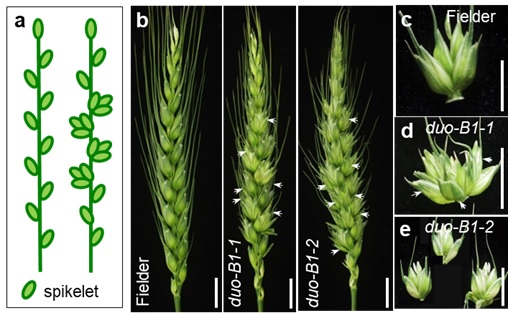 研究首先在在二穗短柄草中发现了一个穗多分枝的突变体,并分离到了对应的基因BdDUO1。该基因编码一个ERF类转录因子。该基因的拟南芥同源基因突变后,茎生叶分枝数有微弱提升。而该基因在普通小麦B基因组中的同源基因DUO-B1表达在群体中与穗粒数负相关,暗示参与穗发育调控。对 DUO-B1 敲除后,发现突变体具有多小穗的表型,且其它农艺性状无明显改变。突变体中穗中部会在一个穗节处形成多个小穗,从而提升了穗粒数。