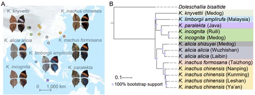 图2 枯叶蛱蝶属蝴蝶采样信息及系统发生关系