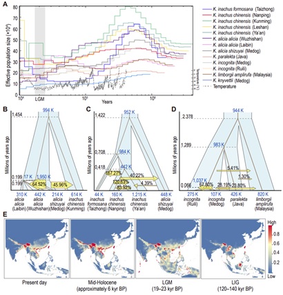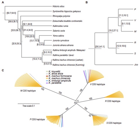 通过采集枯叶蛱蝶属的13个地理种群样本及其他蛱蝶科样本,本研究对共计21属105份蝴蝶标本进行基因组重测序,追溯了枯叶蛱蝶属的起源。系统发育、种群遗传结构及历史种群数量的分析结果表明,枯叶蛱蝶属在系统发生树上形成单系,各物种存在较为独立的遗传背景,多个种群曾随地球温度下降而出现种群数量的减少。随后的种群动态历史分析、基于最大熵模型的栖息地建模及对系统发生树进行时间矫正的结果显示,多个种群由墨脱地区迁出向东南亚的岛屿扩散,而喜马拉雅山脉东部地区在多个历史时期为枯叶蛱蝶属提供了适宜度较高的栖息地,且属内物种分化时间对应了青藏高原的隆升时间。综合以上分析结果,本研究提出,由于青藏高原隆升形成的丰富山地微环境促进了枯叶蛱蝶属物种分化,使喜马拉雅山脉东部地区成为枯叶蛱蝶属的分化中心。