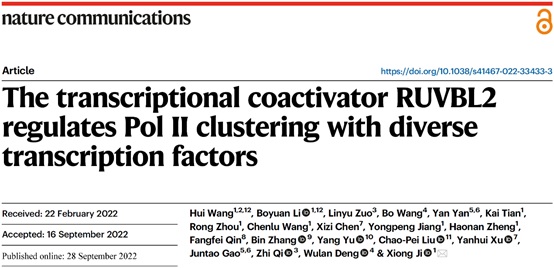 2022年9月28日,Nature Communications在线发表了来自冰球突破mg正规官网季雄课题组题为“The transcriptional coactivator RUVBL2 regulates Pol II clustering with diverse transcription factors”的研究论文。研究者通过多种质谱筛选鉴定和多学科技术证实AAA+家族ATPase分子RUVBL2能够直接控制活跃启动子附近的Pol II 转录工厂。RUVBL2在多种癌症中高表达,与癌症发生相关,是癌症抑制剂的热门靶点之一。该研究进一步鉴定出RUVBL2-Pol II 通路的直接调控基因,其中包括c-Myc等。相关工作为理解Pol II转录工厂提供新型因子,并且也为抗肿瘤靶点应用提供新的思路。