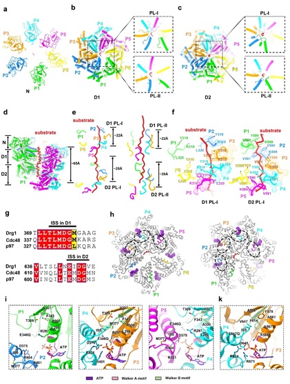 基于高分辨结构,该研究解析了Drg1的高分辨结构。研究发现与其他经典的II型AAA+ ATPase类似, 由NTD,D1和D2形成三层结构,并形成同源六聚体发挥功能。有趣的是,Drg1的NTD虽在序列与Cdc48/p97同源性较低,其三维结构却是高度相似的;这从结构上也提示着,Drg1在发挥功能时可能也需要将底物蛋白彻底解折叠成多肽。在底物结合状态下的Drg1六聚体结构中,Drg1蛋白的保守结构域Walker A、Walker B、Sensor I、Sensor II、arginine finger (AF)、pore loops I 和II (PL-I和PL-II)、ISS等都清晰可见。Drg1的D1和D2通过保守的Pore-loop(PL)芳香族氨基酸残基围绕着底物,并且呈螺旋阶梯式上升,每个PL像是一个抓住底物的手,以 “Hand-over-hand”的方式进行底物的转运。Drg1的六个亚基(P:protomer)中, P1-5通过PLs与多肽底物发生相互作用,而P6远离底物,且D2的核苷酸结合口袋是空的。基于对结构的分析推测Drg1的作用机制如下:当P6结合ATP后,会重新结合底物,继而转变为P1的状态;同时,P5结合的ATP会水解成ADP,转变为P6的状态,并远离底物,Drg1以此模式周而复始的进行底物的去折叠和转运。结构显示Drg1保守的ISS(Inter-subunit signaling)motif参与了相邻亚基间的协同作用以及通过其构像变化调控ATPase活性。结合ATP后,邻近protomer的ISS会由螺旋构象(Helical conformation)转变为三角形的loop(Triangular loop),并伸向核苷酸结合口袋;同时,ISS的构象变化和PLs与底物的结合和解离相偶联。遗传数据也表明ISS、D1-D2之间的linker和PLs的突变均会影响核糖体的组装效率和细胞的生长。