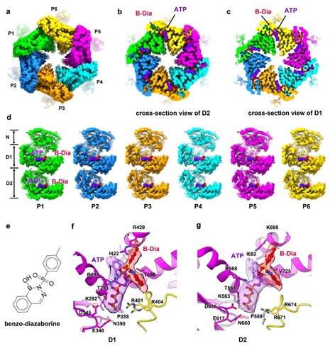Diazaborine最初被发现为一种抗菌化合物,能阻碍脂肪酸和磷脂的生物合成,从而防止细菌增殖。Diazaborine能够抑制Drg1的ATPase活性,从而导致穿梭蛋白在pre-60S上的积累,影响pre-60S的成熟。在解析的B-Dia结合的Drg1六聚体结构中,可以清晰的看到12个ATP/B-dia结合在D1和D2的核苷酸结合口袋中。B-Dia与ATP分子中核糖的2’-OH形成共价键,抑制了ATP的水解,将Drg1锁在一个较平、对称的结构,从而阻断了D1和D2的构象变化和功能的执行。