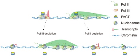 图3. Pol III 通过FACT和局部染色质结构调控临近Pol II基因的转录速率模型