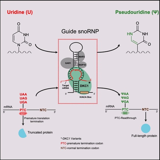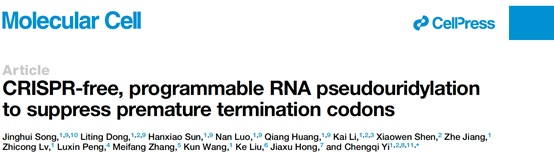 2022年12月14日,冰球突破mg正规官网伊成器课题组在Molecular Cell杂志在线发表了题为CRISPR-free, programmable RNA pseudouridylation to suppress premature termination codons的研究论文,首次报道了名为RESTART(RNA Editing to Specific Transcripts for Pseudouridine-mediAted PTC-ReadThrough)的新型RNA单碱基编辑技术。该技术利用改造的guide snoRNA,招募细胞内源的假尿苷合成酶复合物,在RNA特定位点处实现高效、准确地尿苷(U)到假尿苷(Ψ)的编辑。在mRNA的无义突变位点精准引入假尿苷修饰,将提前终止密码子转换成ΨAA、ΨAG或ΨGA,以实现提前终止密码子的通读及功能蛋白的全长表达。